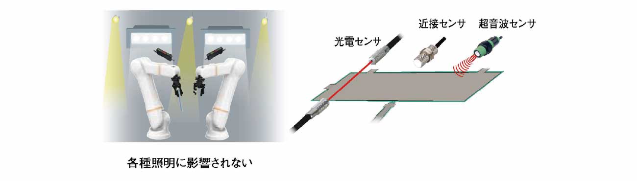 周囲の光や他のセンサの影響を受けずに安定検出ができます。