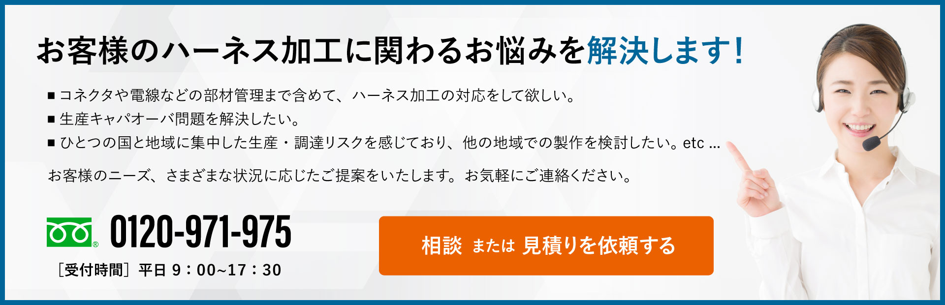 ケーブルやコネクタの別途手配やそれらの末端加工や管理などの煩雑な作業、さらに不具合発生時の責任の所在など、設計・調達・生産技術部門の方々が抱える課題を解決します。