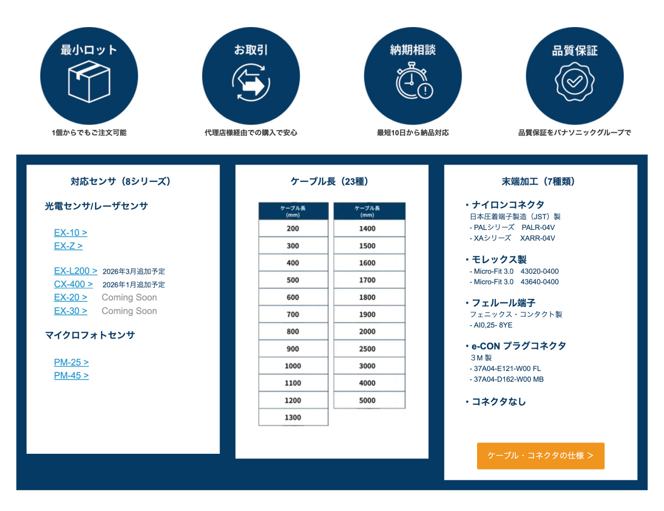 パナソニックの「センサ 一発仕上げ便」は、パナソニックインダストリー製のセンサ × ケーブル長 × コネクタの組み合わせをセミカスタム注文、最短10日~(営業日)でお客様に納品するサービスです。