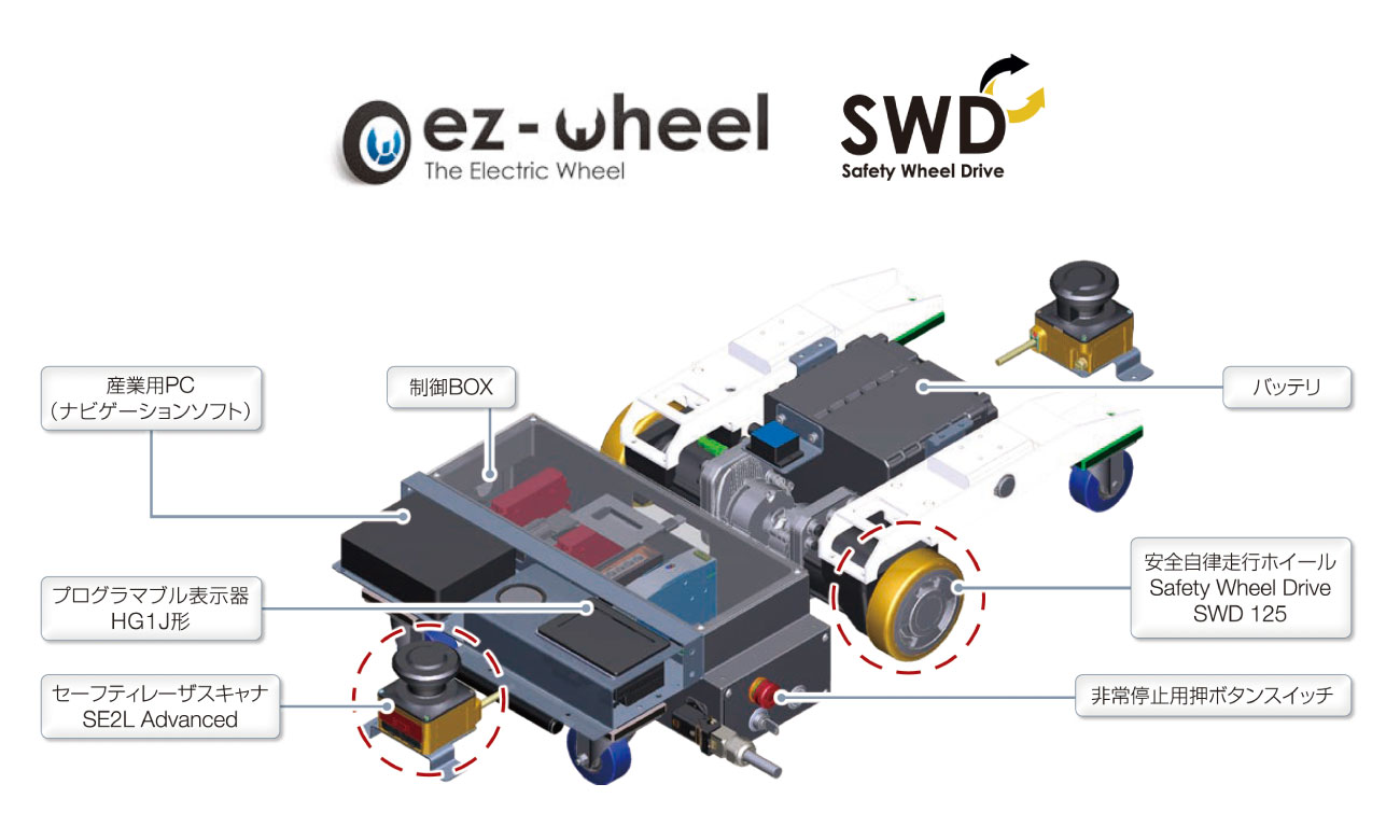 「SE2L Advanced」は、IDECが提供する安全自律走行ホイール「Safety Wheel Drive」と組み合わせることで、安全機能を備えた、人と共存するエリアで稼働するAGV/AMRを簡単に構築できます。(「Safety Wheel Drive」は全系と駆動系のシステムを搭載したホイールです。)
